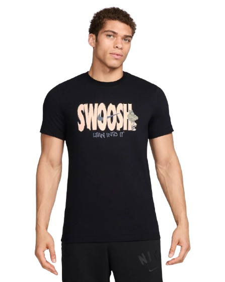 • Color negro (010‑010) con el texto “SWOOSH” o «Lean Into It» estampado en el pecho en tonos claros o gráficos según versión